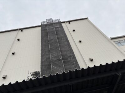 今回の現場では、建物の外壁に沿って高所までしっかりと足場を組み上げています